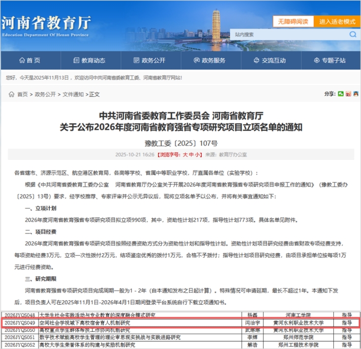 近日,中共河南省委教育工作委员会、河南省教育厅公布了2026年度河南省教育强省专项研究项目立项名单,我院辅导员闫治宇老师主持的《空间社会学视域下高校宿舍育人机制研究》项目成功获批。这是我院首次实现学生管理工作科研领域省级专项研究项目突破,标志着学院学生工作科研水平迈上新台阶。