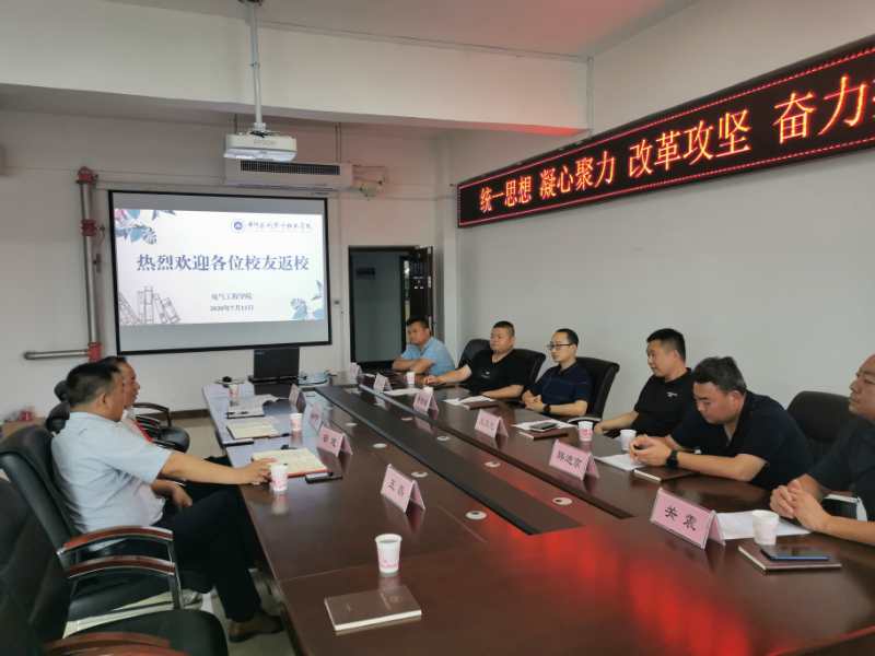 时逢河南省完美网页版校友会成立大会召开之际,2020年7月11日下午,电气工程学院校友在实训楼5521会议室举行座谈会。学院党总支书记胡健、院长杜广朝、副书记管欣、副院长王磊,以及各教研室主任、三办主任参加了座谈会,会议由副书记管欣主持。