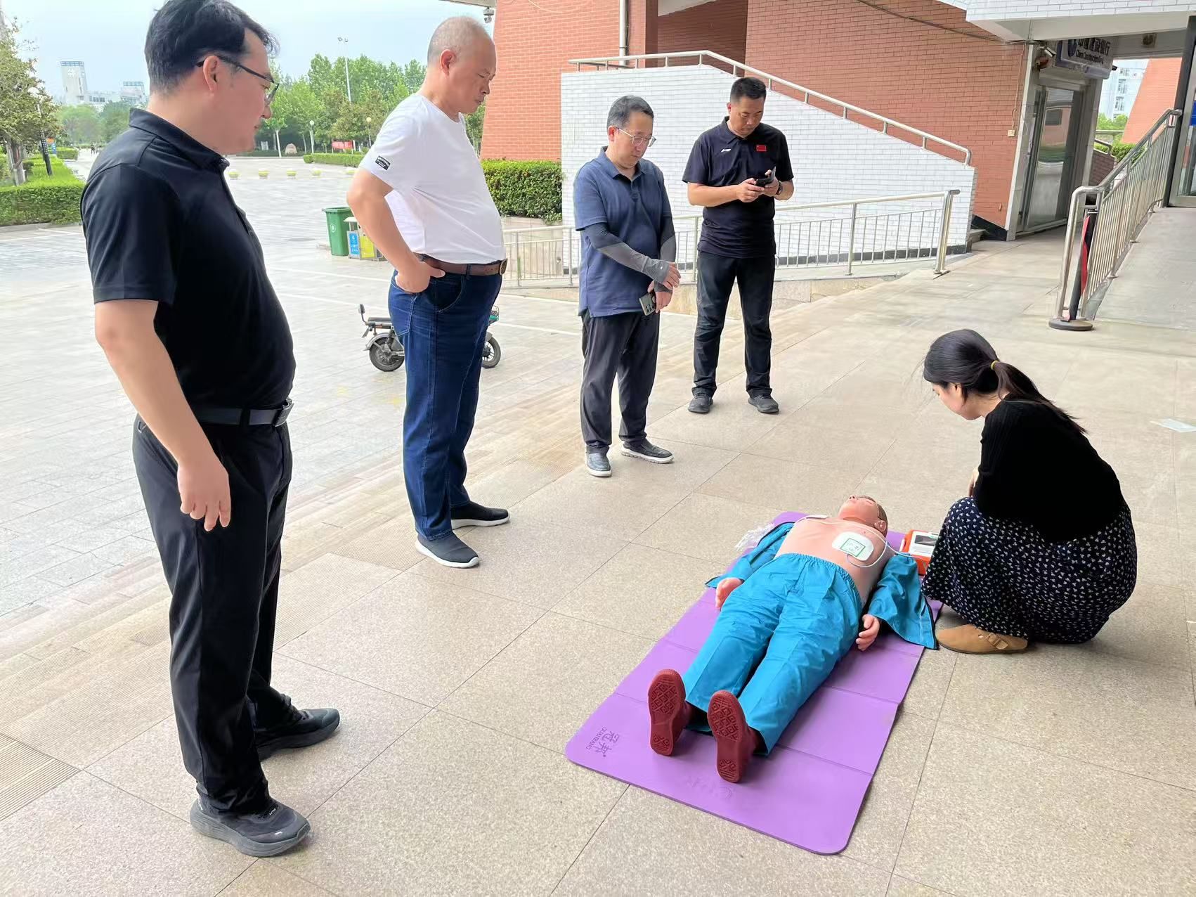 杨士恒、周志琦一行先后深入校园湖泊、后勤管理服务中心防汛物资仓库、木工房、餐厅等重点区域,进行了全面细致的安全、防汛排查。详细核查了沙袋、抽水泵等物资储备数量及维护状态,并对设备更新和维护提出了明确要求。期间,听取了后勤管理服务中心、保卫处关于校园安全防范、防汛措施、值班值守等工作的汇报,并通过模拟人教具现场展示学习了心肺复苏的规范操作流程。