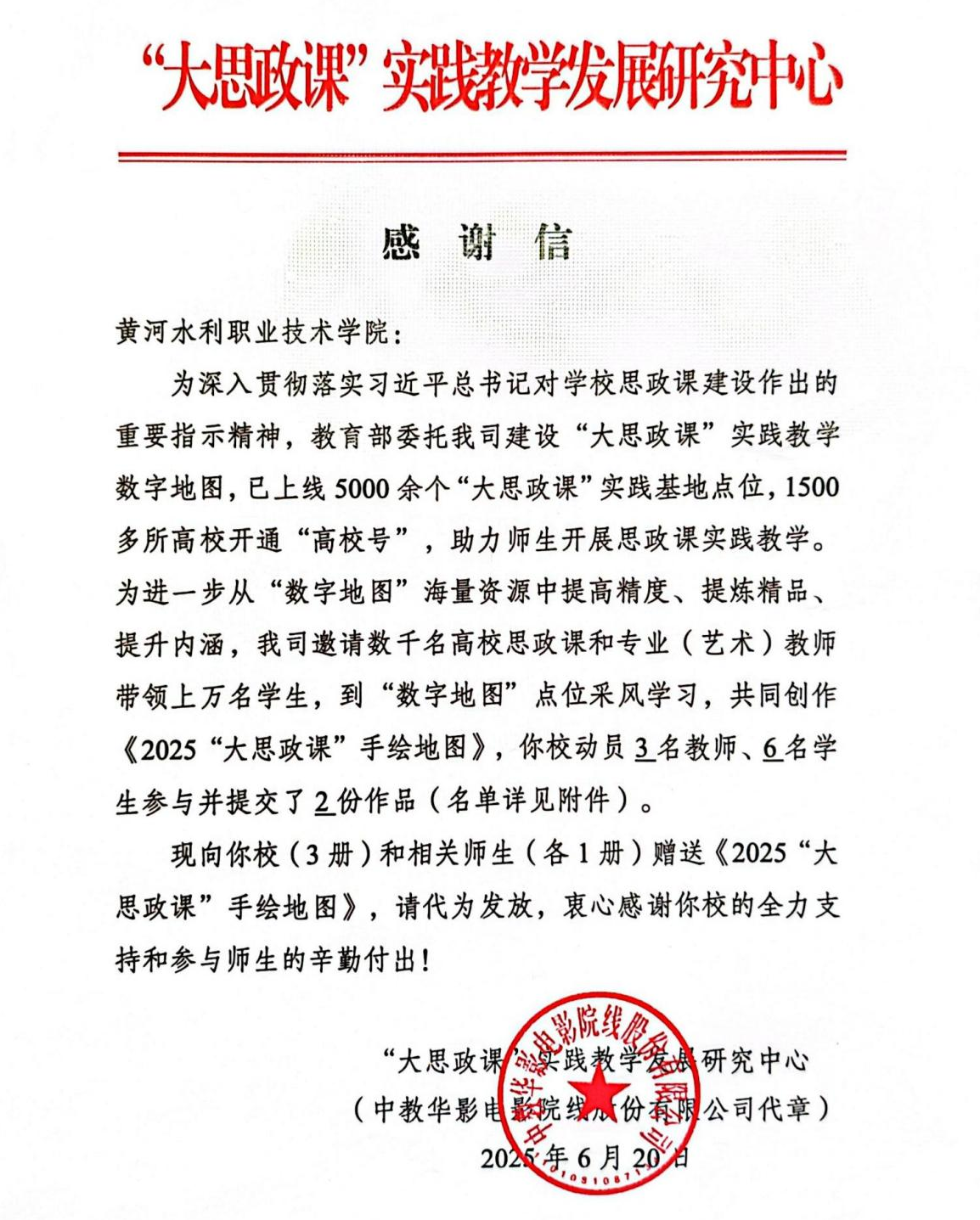 近日,完美网页版收到教育部“大思政课”实践教学发展研究中心的感谢信,对学校积极组织师生参与2025“大思政课”“手绘地图”项目表示肯定。