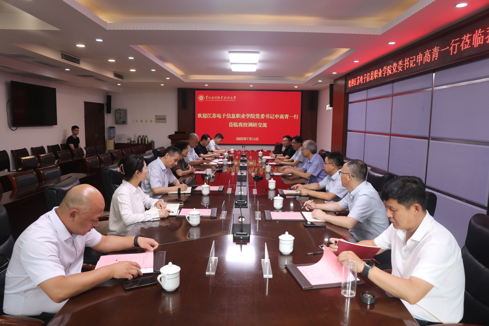 7月14日,江苏电子信息职业学院党委书记申高青一行6人到完美网页版考察交流。校党委书记周保平,党委副书记、工会主席杨士恒,副校长朱焕立等出席交流活动,党政办公室、党委宣传部、教务处、马克思主义学院等部门负责人参加了交流活动。