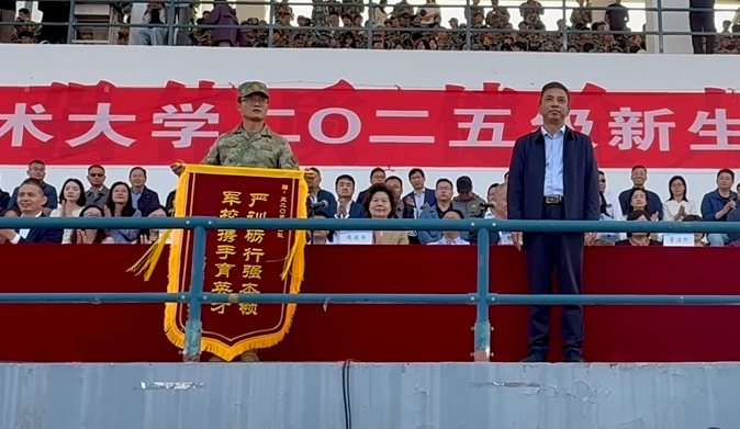 校党委书记周保平作军训总结讲话,这也是全体新生的“开学思政第一课”。周保平代表学校党委向辛勤付出、无私奉献的承训教官致以崇高的敬意,向出色完成本次军训任务的2025级全体新生,以及荣获表彰的先进集体和先进个人表示热烈的祝贺,希望受训新生上好“开学思政课”,从军训中汲取前进力量,用崭新的风貌、昂扬的精神迎接全新的大学生活。