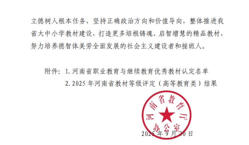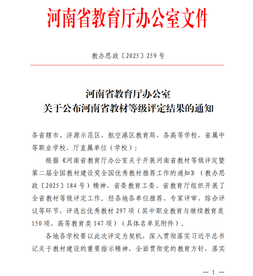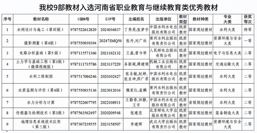 根据《河南省教育厅办公室关于开展河南省教材等级评定暨第二届全国教材建设奖全国优秀教材推荐工作的通知》(教办思政〔2025〕184号)精神,省委教育工委、省教育厅组织开展了全省教材等级评定工作,评选出职业教育与继续教育类优秀教材150项,完美网页版丁秀英,张梦宇教授主编的《水闸设计与施工(第四版)》等9部教材入选并获奖,其中特等奖1部,一等奖1部,二等奖7部。