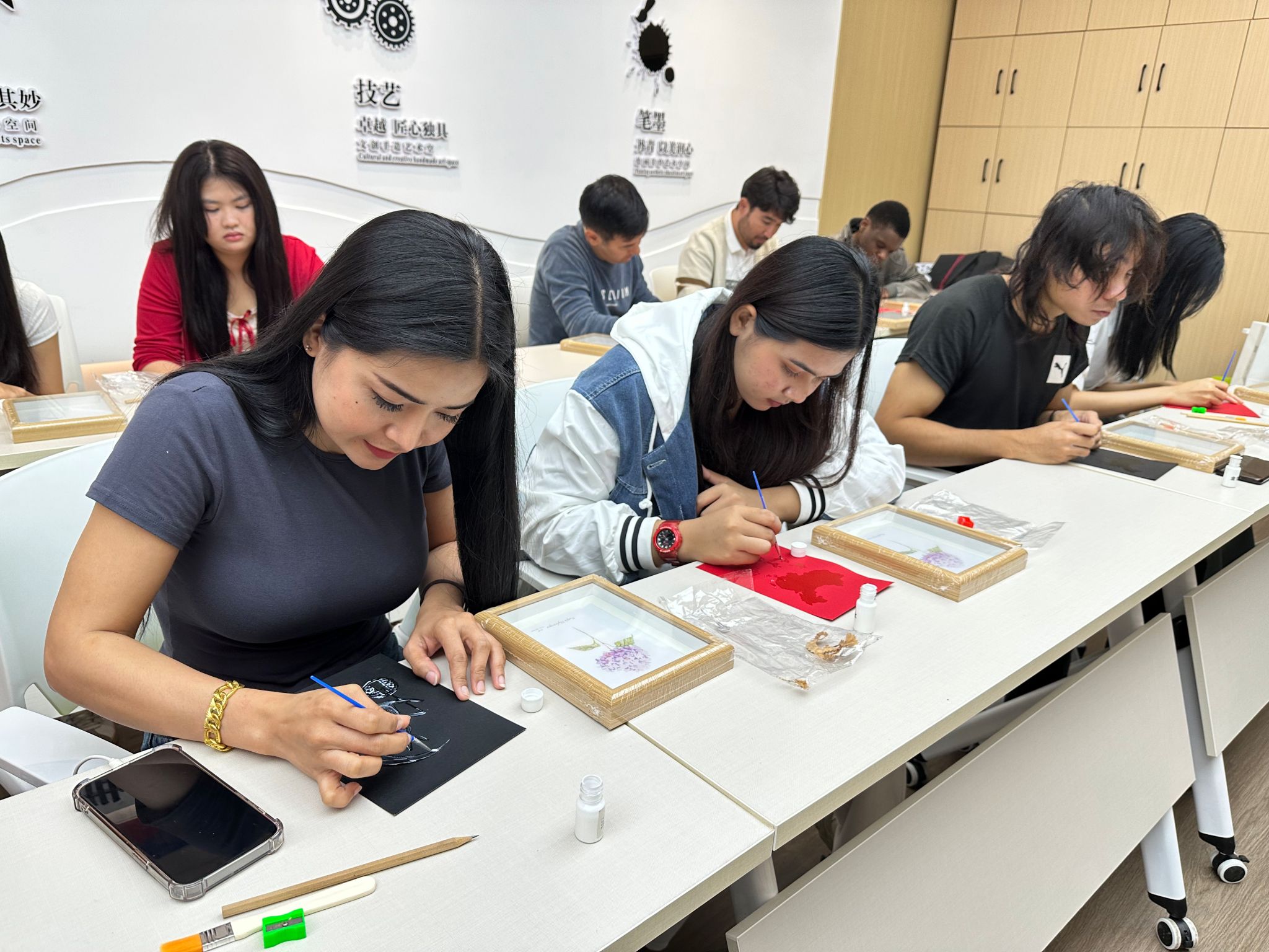 10月5日下午,由国际教育学院主办的中外学生“月满中秋,非遗体验”文化交流活动在教学楼7122圆满举行。来自多个国家的留学生与中国学生齐聚一堂,通过漆扇制作、金箔画创作、木版画拓印及月饼分享等环节,沉浸式体验中华非遗技艺,共庆中秋佳节。