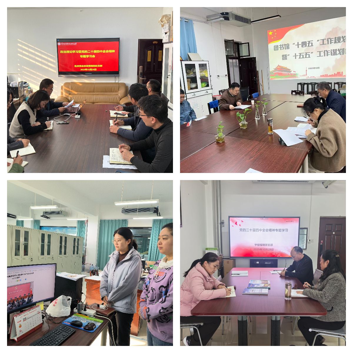 为全面学习好、宣传好、贯彻好党的二十届四中全会精神,将全会精神深度融入学校发展规划与实践推进各环节,用党的创新理论成果推动学校各项事业高质量发展,10月28日,全校各部门、各单位分别组织教职工传达学习《中共中央关于制定国民经济和社会发展第十五个五年规划的建议》《中国共产党第二十届中央委员会第四次全体会议公报》,切实将思想和行动统一到党中央的决策部署上来,在全校迅速掀起学习热潮。