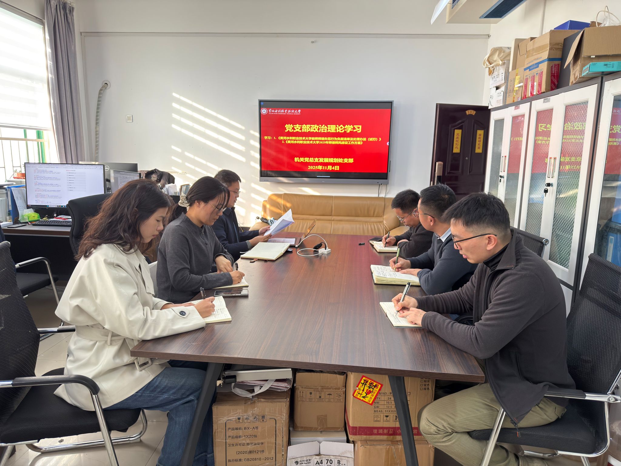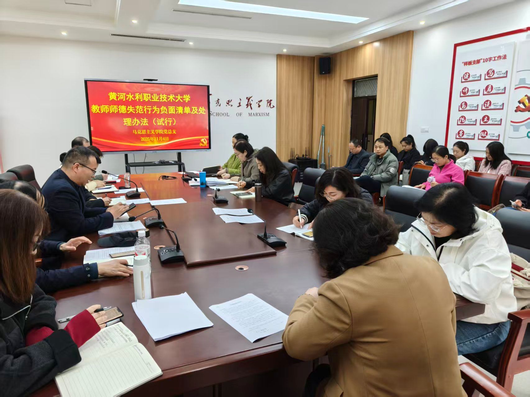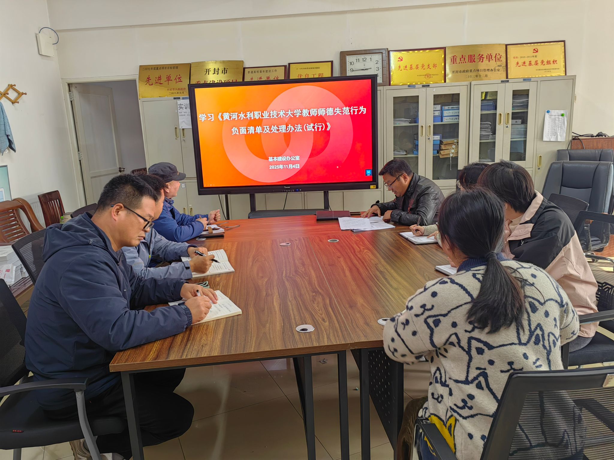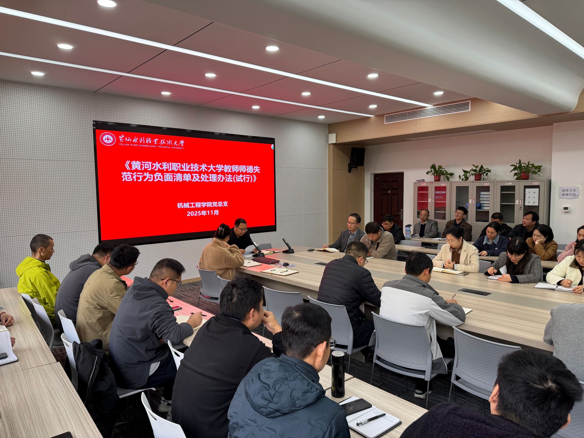 为贯彻落实《黄河水院2025年下半年政治理论学习及思想道德教育计划》学习要求,11月4日,全校各部门、各单位分别组织教职工传达学习《黄河水利职业技术大学教师师德失范行为负面清单及处理办法(试行)》(黄水党〔2025〕16号)和《黄河水利职业技术大学2025年师德师风建设工作方案》,引导全校教师准确把握师德师风建设第一标准的深刻内涵,不断提升师德师风建设水平,努力构建教风清明、校风清正的育人环境,助力学校高质量发展。(供图:各相关部门)