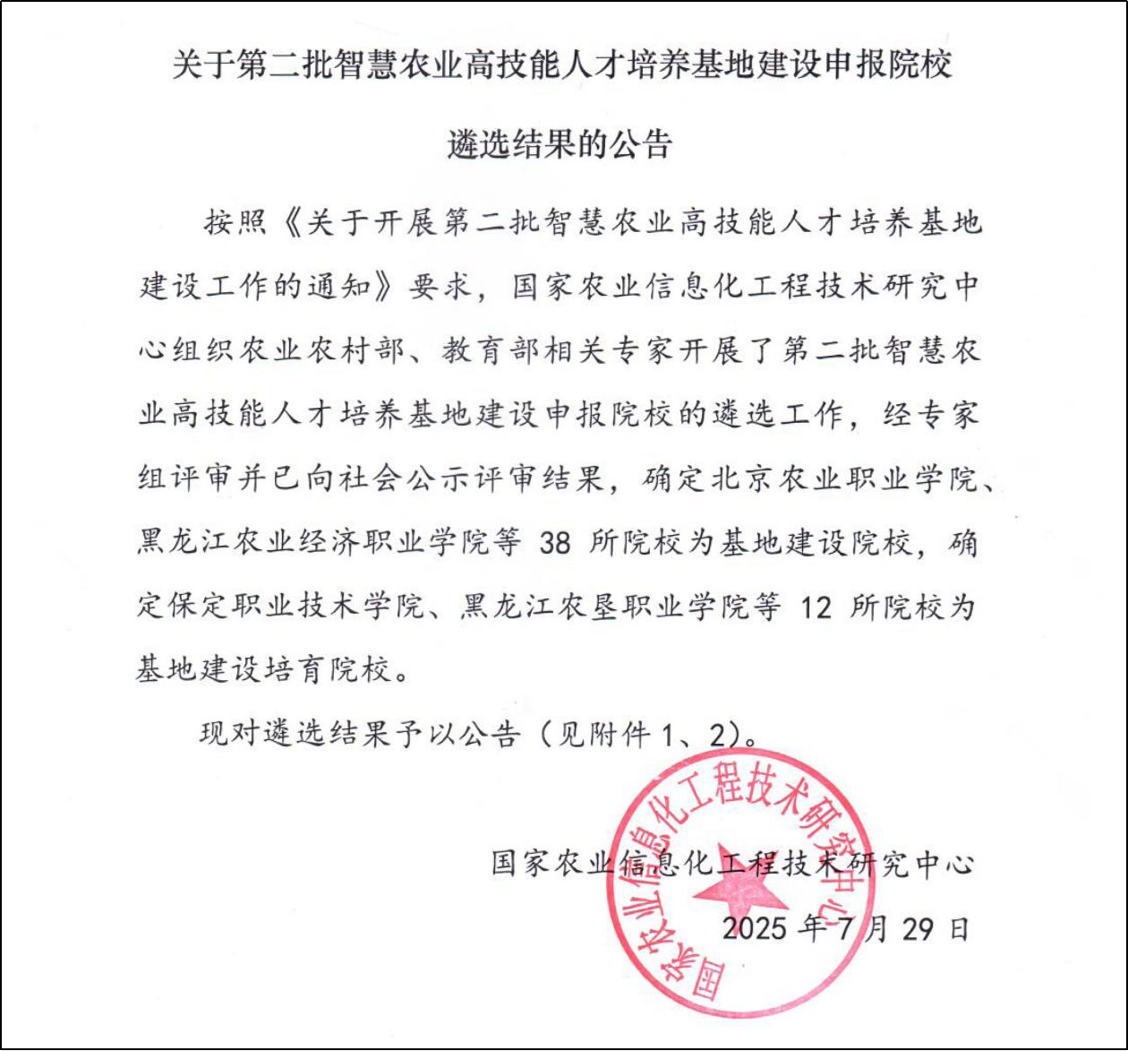 第二批智慧农业高技能人才培养基地遴选工作由全国农业职业教育教学指导委员会和农业农村部科学技术司指导,国家农业信息化工程技术研究中心组织农业农村部、教育部相关专家共同开展。基地建设以三年为周期,旨在培育一批人才培养体系健全、教学教研特色鲜明、实训设施设备先进、运行组织管理科学、技能型人才培养成效突出的高水平智慧农业人才培养基地,服务国家农业现代化和乡村振兴战略。