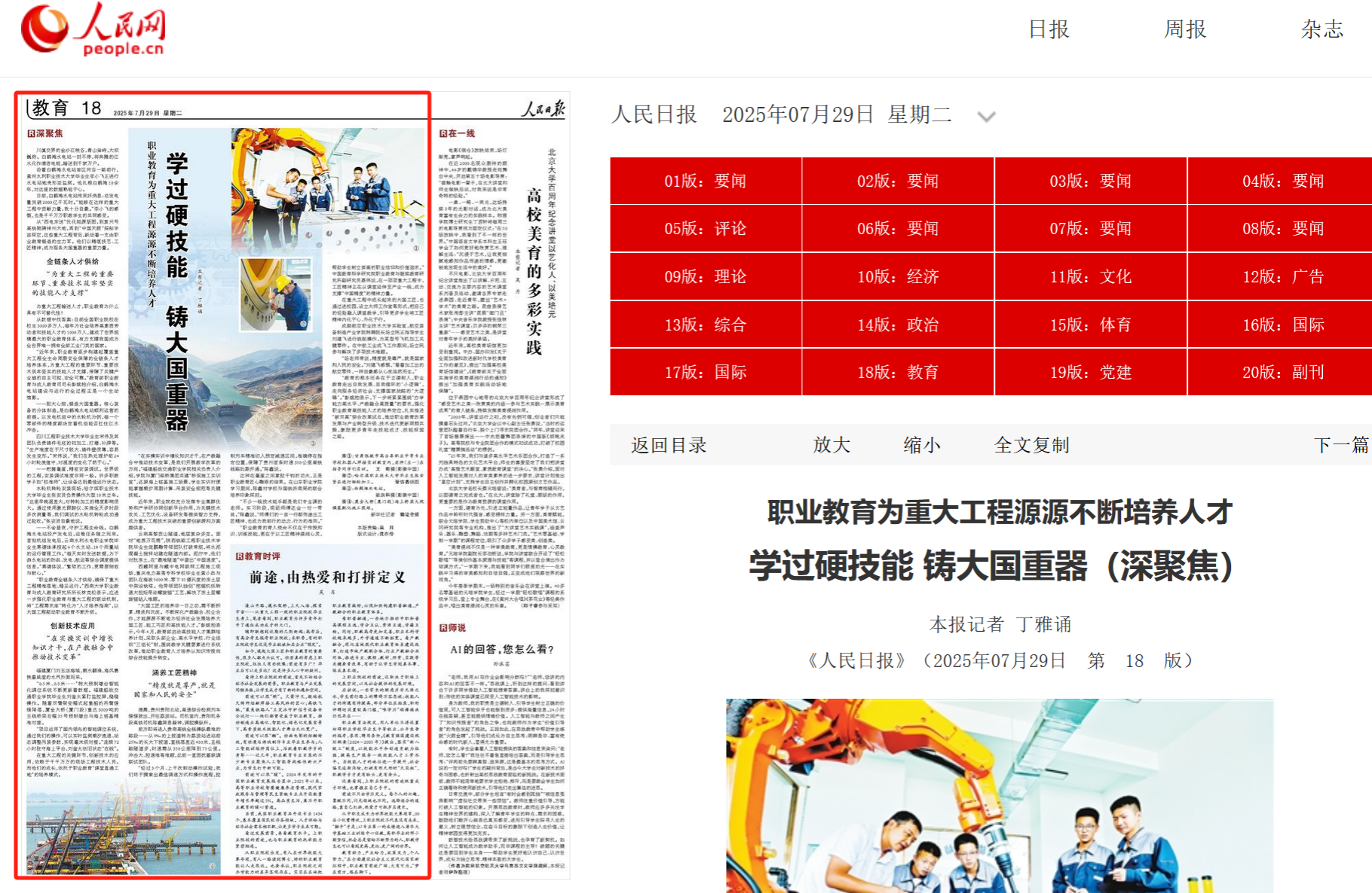 7月29日,人民日报教育版以“职业教育为重大工程源源不断培养人才 学过硬技能 铸大国重器”为题,展示了职业教育服务地方经济发展的生动图景,被新华网、教育部门户网站、微言教育等转载。报道以黄河水利职业技术大学毕业生服务白鹤滩水电站为切入点,深度聚焦职业院校人才培养,解读职业教育服务经济社会、支撑国家战略的“大逻辑”。
