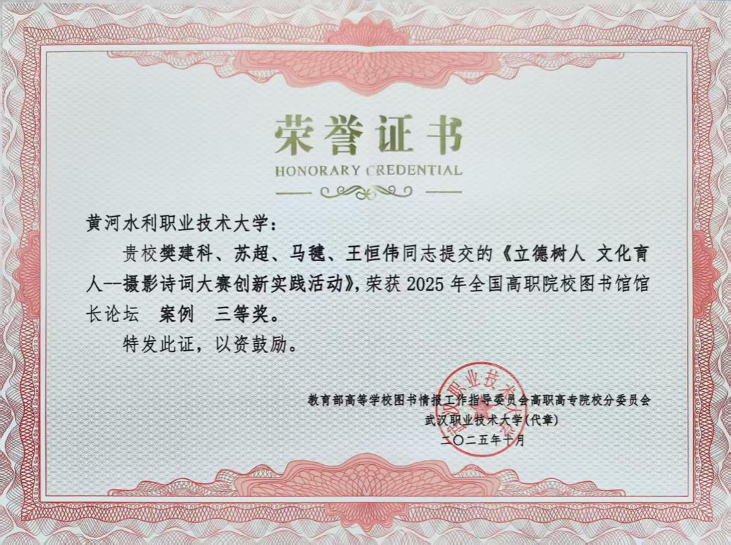 近日,在教育部高等学校图书情报工作指导委员会高职高专院校分委员会主办的“2025年全国高职院校图书馆馆长论坛”案例与论文征集评选活动中,完美网页版图书馆凭借《立德树人 文化育人——摄影诗词大赛创新实践活动》案例,与省内另一所高校图书馆共同斩获三等奖,这也是完美网页版首次在该类国家级评选中获奖,成功填补了学校在此领域的奖项空白。