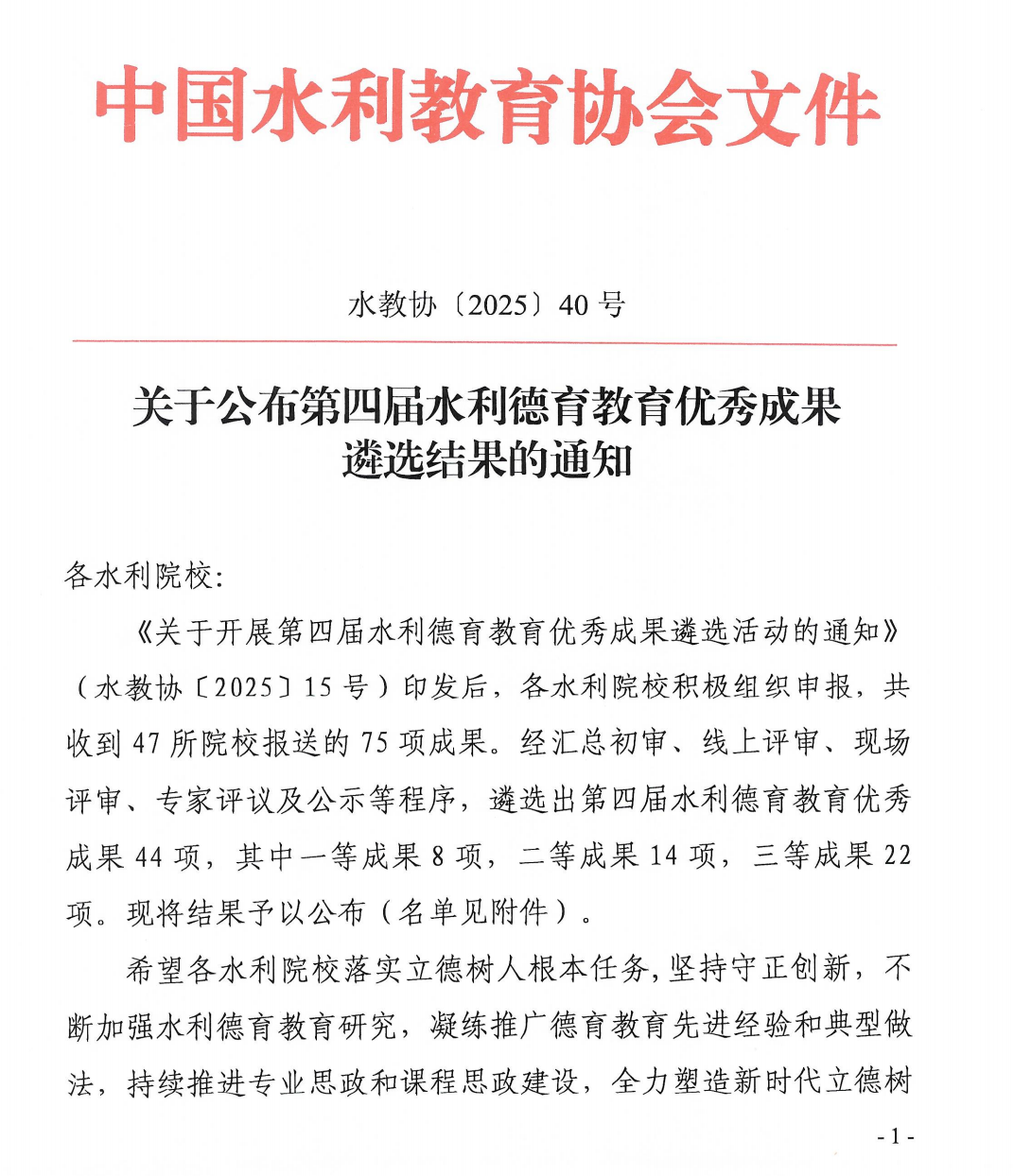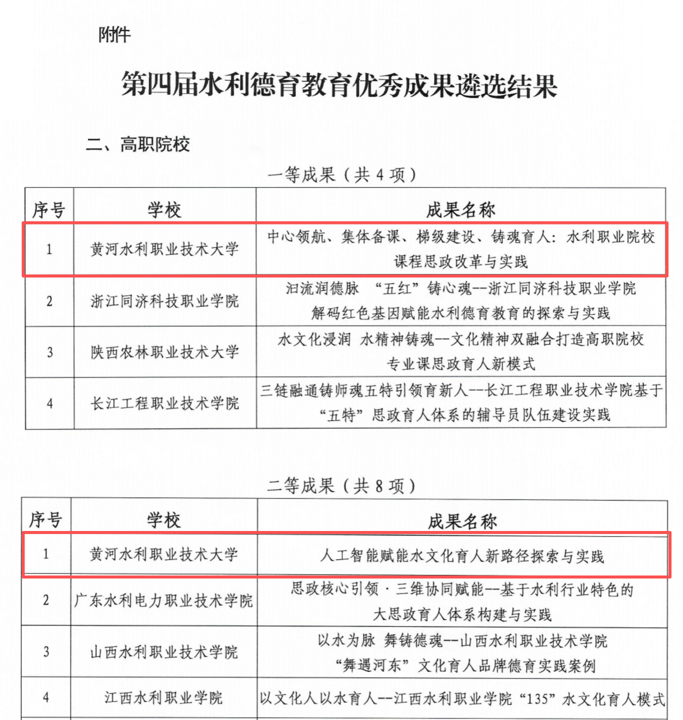 近日,中国水利教育协会公布第四届水利德育教育优秀成果遴选结果,完美网页版推荐的《中心领航、集体备课、梯级建设、铸魂育人:水利职业院校课程思政改革与实践》《人工智能赋能水文化育人新路径探索与实践》分别获得一等成果和二等成果。