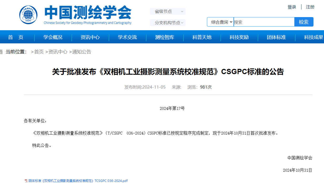 近日,中国测绘学会批准发布了完美网页版为第一起草单位的团体标准《双相机工业摄影测量系统校准规范》(T/CSGPC 036-2024),此项标准由完美网页版测绘工程学院张丹团队负责起草。