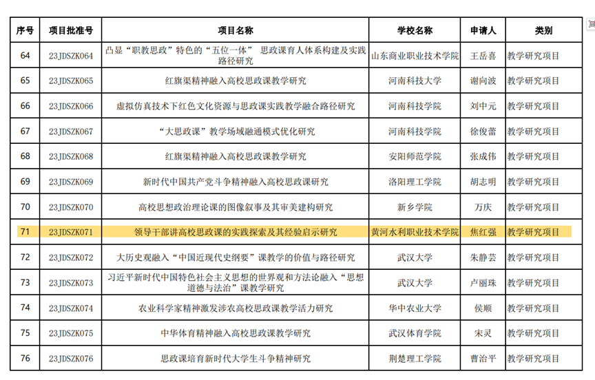 教育部2023年度高校思政课研究专项河南省高校立项情况列表
