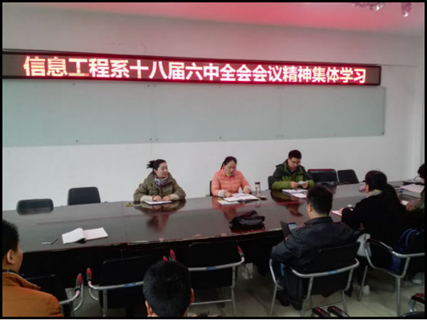 按照校党委总精神,2016年11月1日下午,信息工程系党总支在系会议室组织全系教职工学习党的十八届六中全会精神,会议由系党总支书记丁爱萍主持。