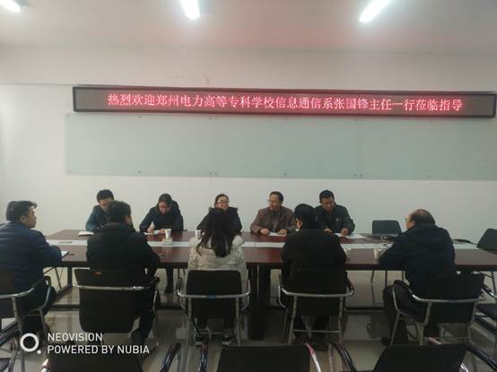20171228日,郑州电力高等专科学校信息通信系系主任张国锋一行五人来完美网页版信息工程系调研考察。信息工程系副主任吕振雷、办公室主任吴丰、网络技术教研室主任曹建春、软件技术教研室主任张向丰、计算机应用技术教研室主任莫丽娟进行了接待,双方简单自我介绍后开始座谈。