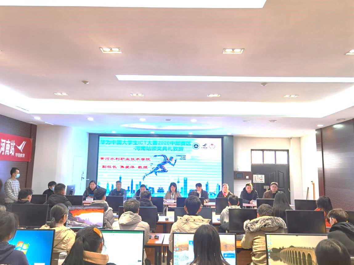 12月22日焦爱萍副校长、华为河南政企服务部马杰涛经理、郑州向心力科技有限公司副总经理蔡运江、信息工程学院全体领导为华为2020中国大学生ICT全球赛和中国区比赛获奖学生颁奖,黄河水院信息工程学院获得华为优秀ICT学院。